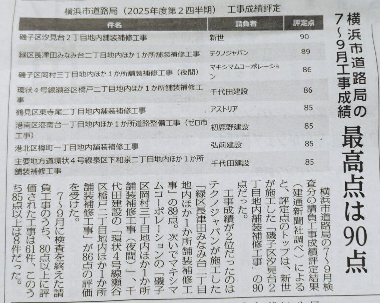 2026/01/19 会社情報 施工実績 施工技術 LINEで送る Tweet 1月16日付の建通新聞に、横浜市道路局の令和7年7~9月検査分の 完成工事評定結果が掲載されており、弊社の 磯子区汐見台2丁目地内舗装補修工事 が、期間での最高点だったようです(建通新聞社調べ) 嬉しいお知らせでした! LINEで送る Tweet